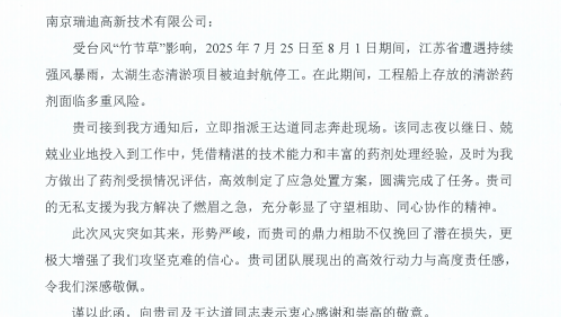 南京瑞迪高新技術(shù)有限公司緊急馳援中交天航局太湖項目部